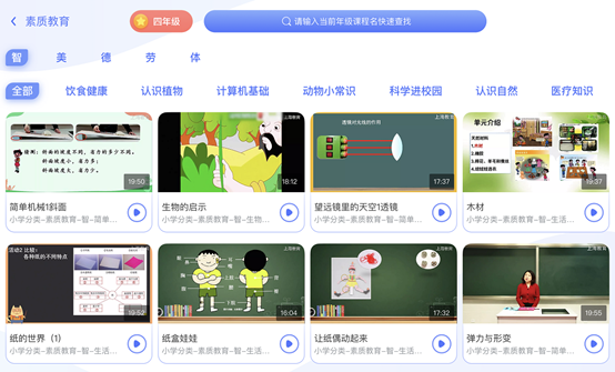 除了基础课程,空中课堂还提供音乐课、舞蹈课等素质教育课程。新学期,将有更多健身、武术、烹饪、美食、情商、艺术类素质教育内容上线。东方明珠充分发挥内容编排和精细化运营的强大能力,全面梳理约4000节素质教育课程,设立德、智、体、美、劳五大维度主题,并根据用户的不同需求细致划分成数百个小分类,打造更具针对性的学习指南。