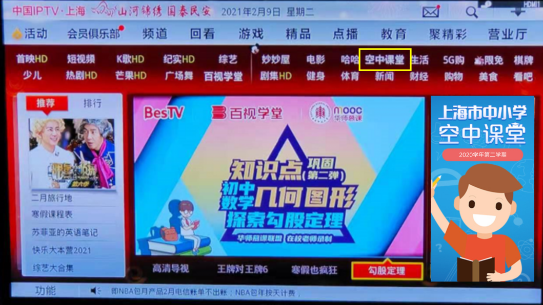 空中课堂作为上海市教委与东方明珠长期合作打造的特色教育品牌,目前已积累了近10000节电视课程,实现从小学到高中全学年全课程全覆盖。新学期将配合教材变更情况,对1000余节课程内容进行更新和上线,让空中课堂不仅仅成为教学的同步在线课堂,更成为优质的系统教学资源库。