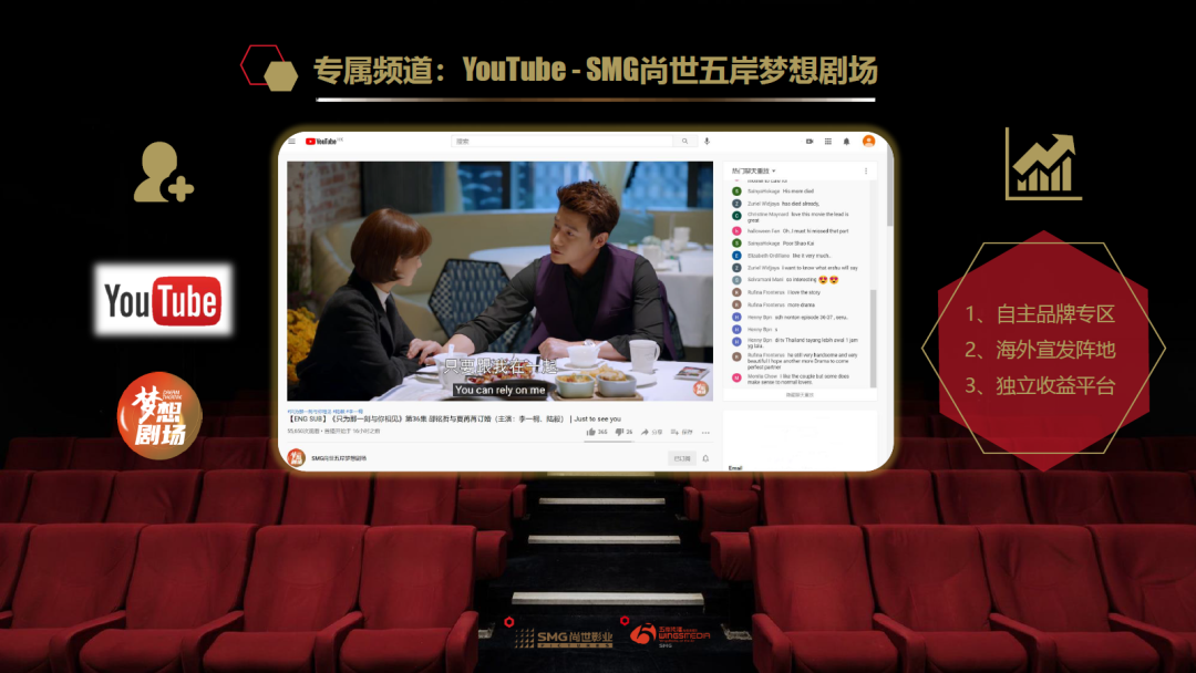 尚世五岸在YouTube上授权运营“梦想剧场”,专门推动国产影视剧内容在全球互联网的传播。《在一起》《只为那一刻与你相见》《甜蜜》等剧集播出后,用户订阅数不断攀升中。同时联动Facebook、Twitter等社交媒体,建立宣发矩阵,及时发布中国影视资讯,助力国际发行。