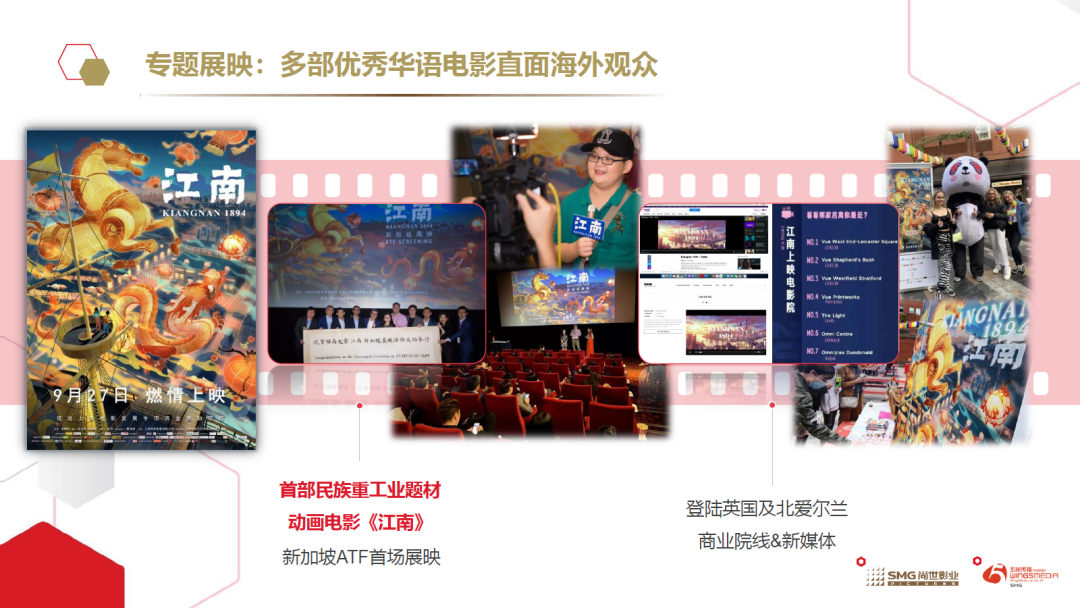 在旧金山举办3D全景声京剧电影《曹操与杨修》、喜剧电影《21克拉》展映活动;在新加坡ATF,首部民族重工业题材的国产动画电影《江南》首登狮城大银幕,由此推动了该片在新加坡、马来西亚等多个国家和地区的发行落地;去年10月,《江南》在英国以及北爱尔兰的商业院线全线上映,成为去年深受疫情影响的海外院线复映后首批上映的华语电影之一。