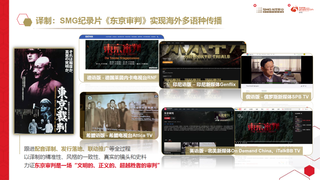 以SMG大型纪录片《东京审判》为例,尚世、五岸参与了德、俄、希腊语、印尼语等多语种译制、发行和海外推广全过程,并制定了个性化译制和宣推方案。比如,在德国RNF电视台黄金时段开播德语版的同时,其官方网站还开设专题网页,同步直播并长时间保留影片,在海外实现“台网播出”。此次成功海推令《东京审判》落地多国主流电视平台和新媒体平台,产生广泛的国际影响。