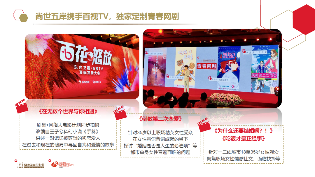 在今年5月“东方卫视·百视TV夏季赏新大会”上,尚世五岸也携手百视TV,联合发布了《在无数个世界与你相遇》、《倒数第二次恋爱》、《为什么还要结婚啊?!》、《吃饭才是正经事》等四部描绘都市众生相的青春网剧,以独家定制等方式积极投身流媒体这一新兴领域,有力支撑流媒体影视内容发展壮大。