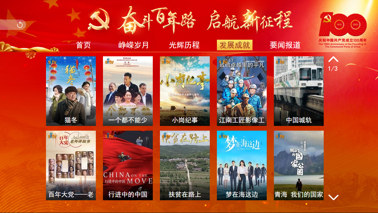 百视通IPTV、OTT全力保障重大活动转播,广泛汇聚包括资讯、纪实、文艺等各类庆祝建党百年节目,落实首页首屏首条建设,上海IPTV、OTT平台统一上线庆祝中国共产党成立100周年开机页面和“建党百年”主题EPG底图,将同庆百年华诞、共铸历史伟业的浓厚氛围推向顶峰。