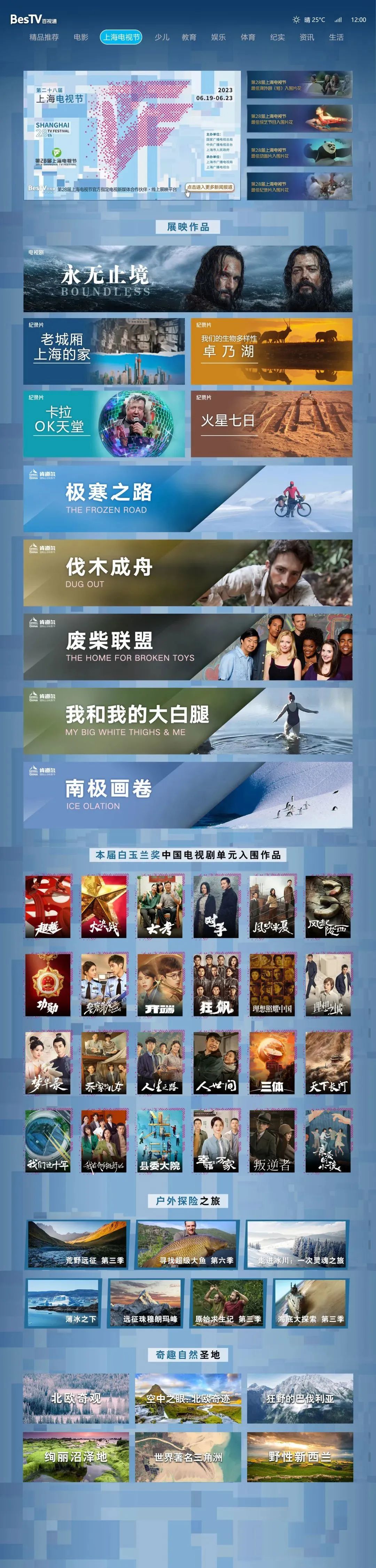 尤为值得一提的是于6月19日电视节开幕当天盛大开启的“线上展映”专区。包括6集西班牙航海冒险剧集《永无止境》、5部肯道尔国际山地电影节纪录⽚《极寒之路》《我和我的大白腿》《废柴联盟》《南极画卷》《伐木乘舟》,以及《卡拉OK天堂》《火星七日》《老城厢 上海的家》《我们的生物多样性-卓乃湖》在内的10部上海电视节线下惠民放映剧目,将全部亮相百视通线上专区,带向全国1.4亿IPTV、互联网电视大屏用户,线上线下同频共振,让全国观众“云上”共享上海电视节。