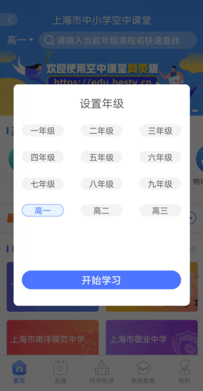 首次进入“空中课堂”,选择学生目前所在年级后,进入相应年级首页。